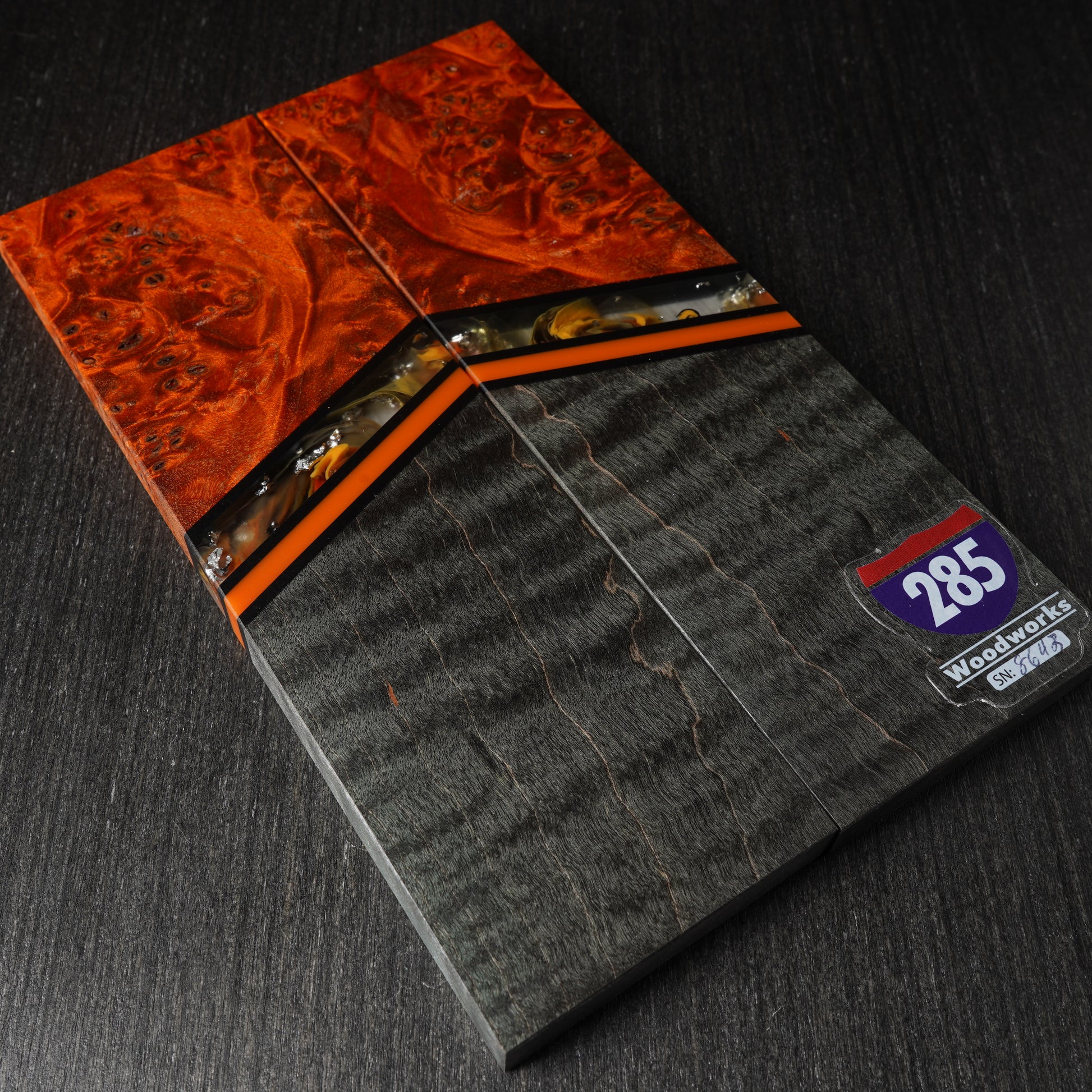These hand crafted segmented knife scales are made one at a time using house stabilized woods and hand cast resin components. They ship flat, even, and ready for glue up. The scales pictured will be the exact set you receive. Buy with complete confidence.