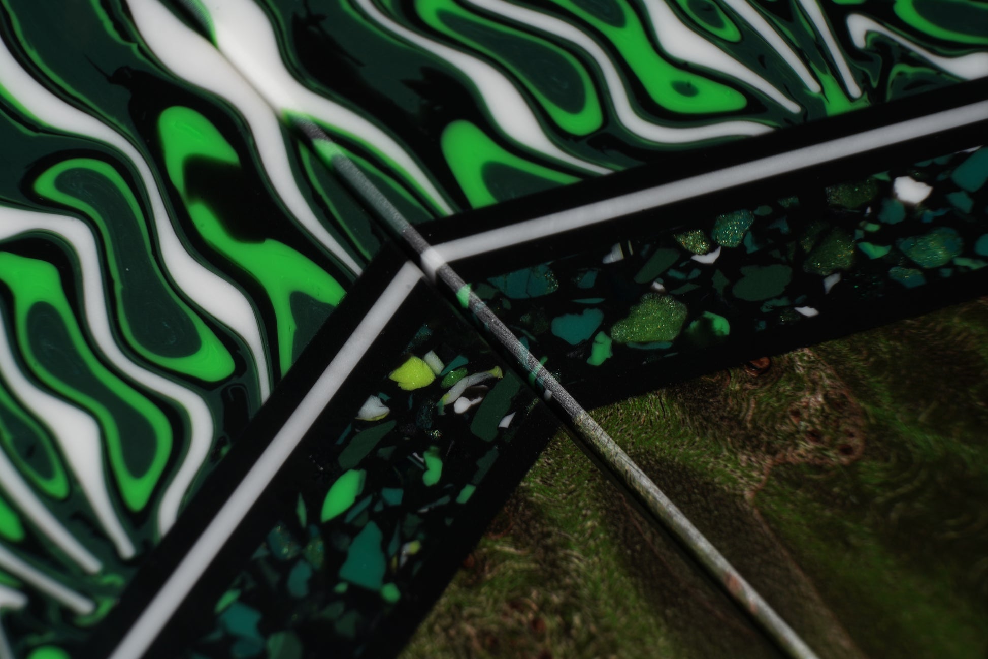 Rich and dynamic, Evergreen Strata blends deep forest green, shimmering emerald tones, and bright lime and white accents within a jet-black base. Subtle sparkles and layered fragments create depth and movement, giving the material a gemstone-inspired elegance with a modern edge.