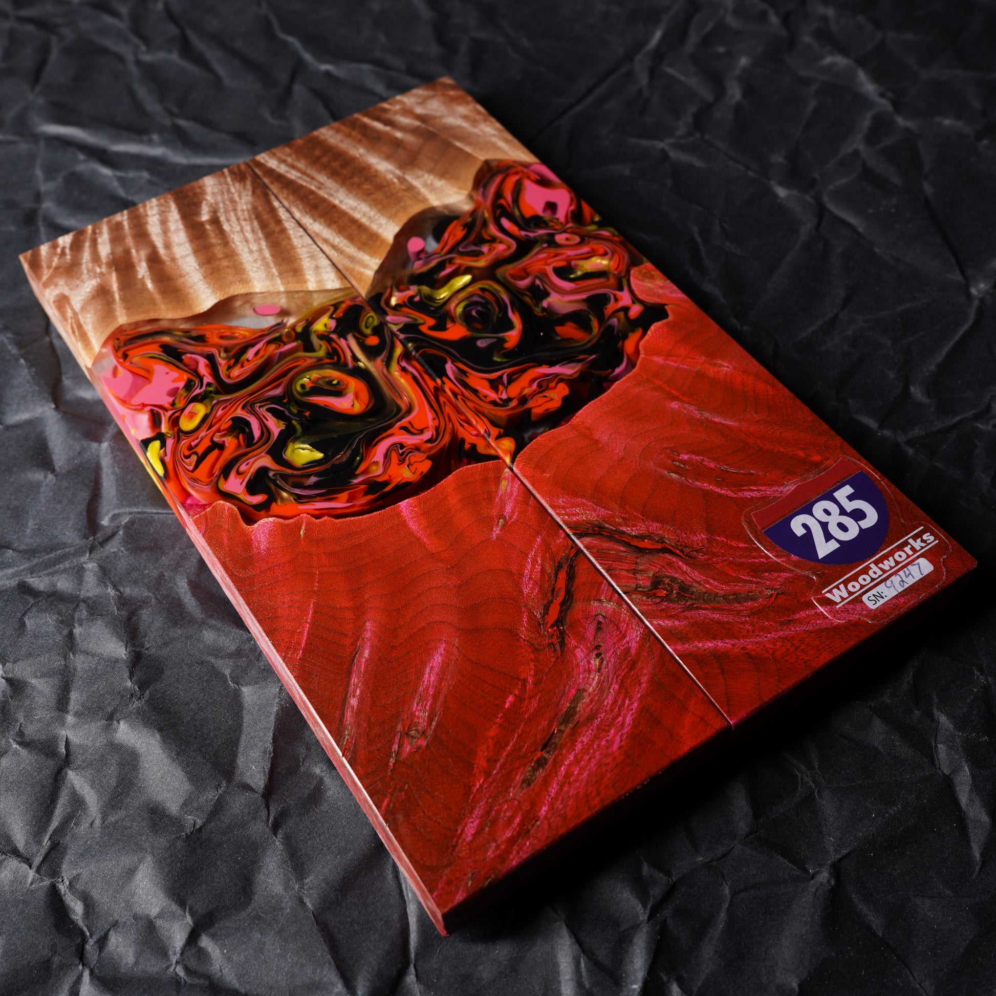 Our hybrid knife scales are made one at a time from vacuum stabilized burl wood and urethane resin. Resulting in a truly unique and exceptional handle. They ship flat, even, and ready for glue up. The knife scales pictured will be the exact set you receive. Buy with complete confidence.