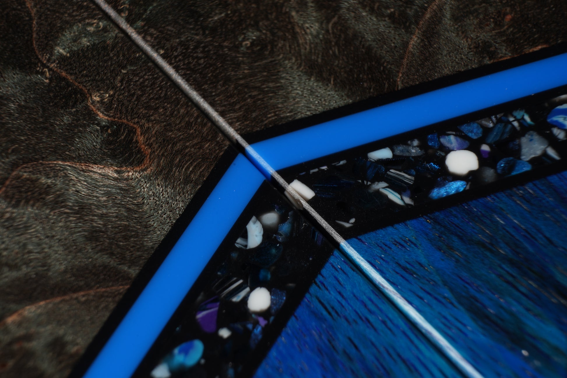 Cool and refined, Polar Strata features a striking mix of icy white, deep navy, cobalt blue, and subtle silver fragments layered within a black base. The crisp color contrasts and subtle banding effects give this pattern a look reminiscent of arctic stone formations and polished minerals.