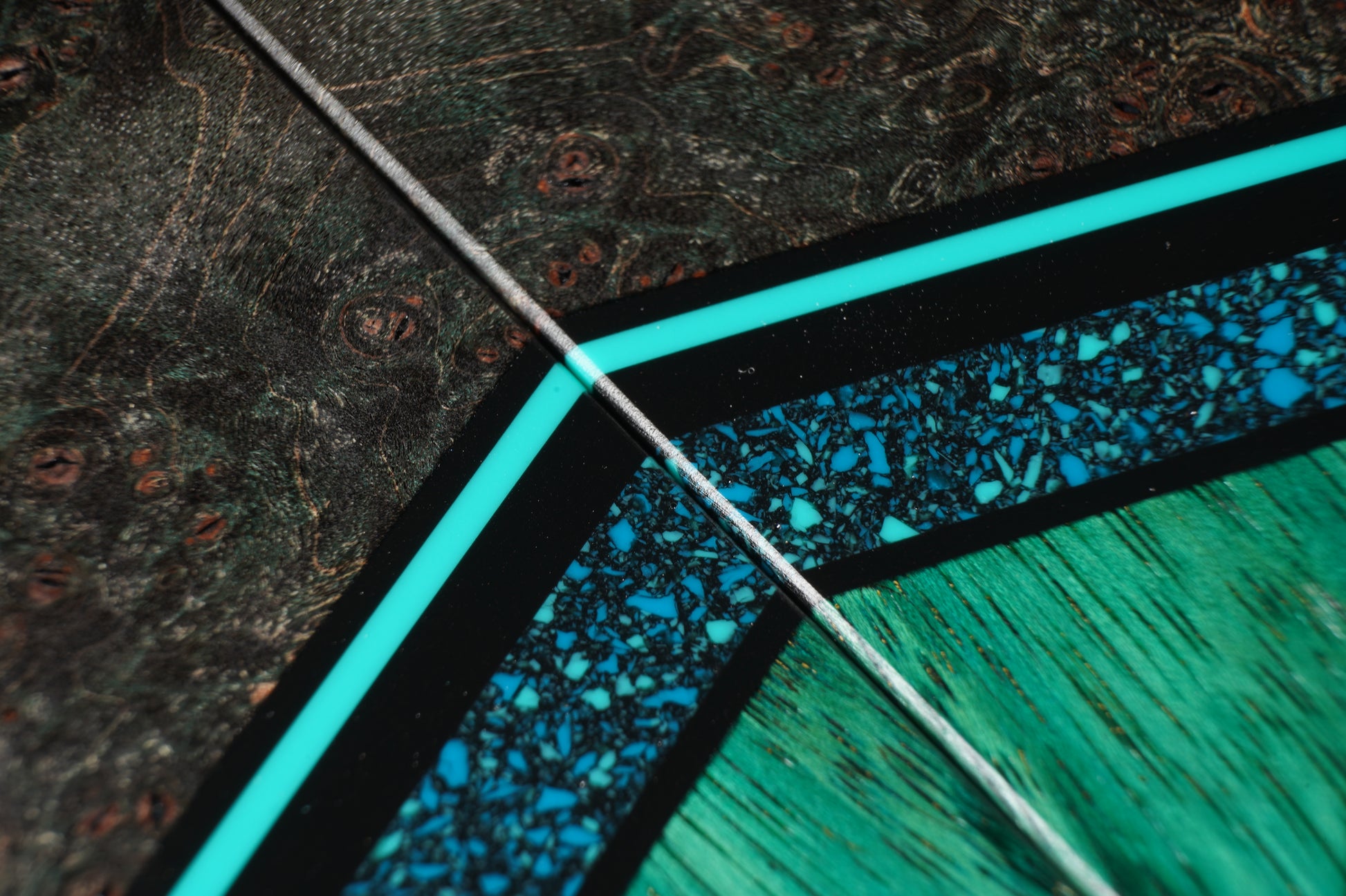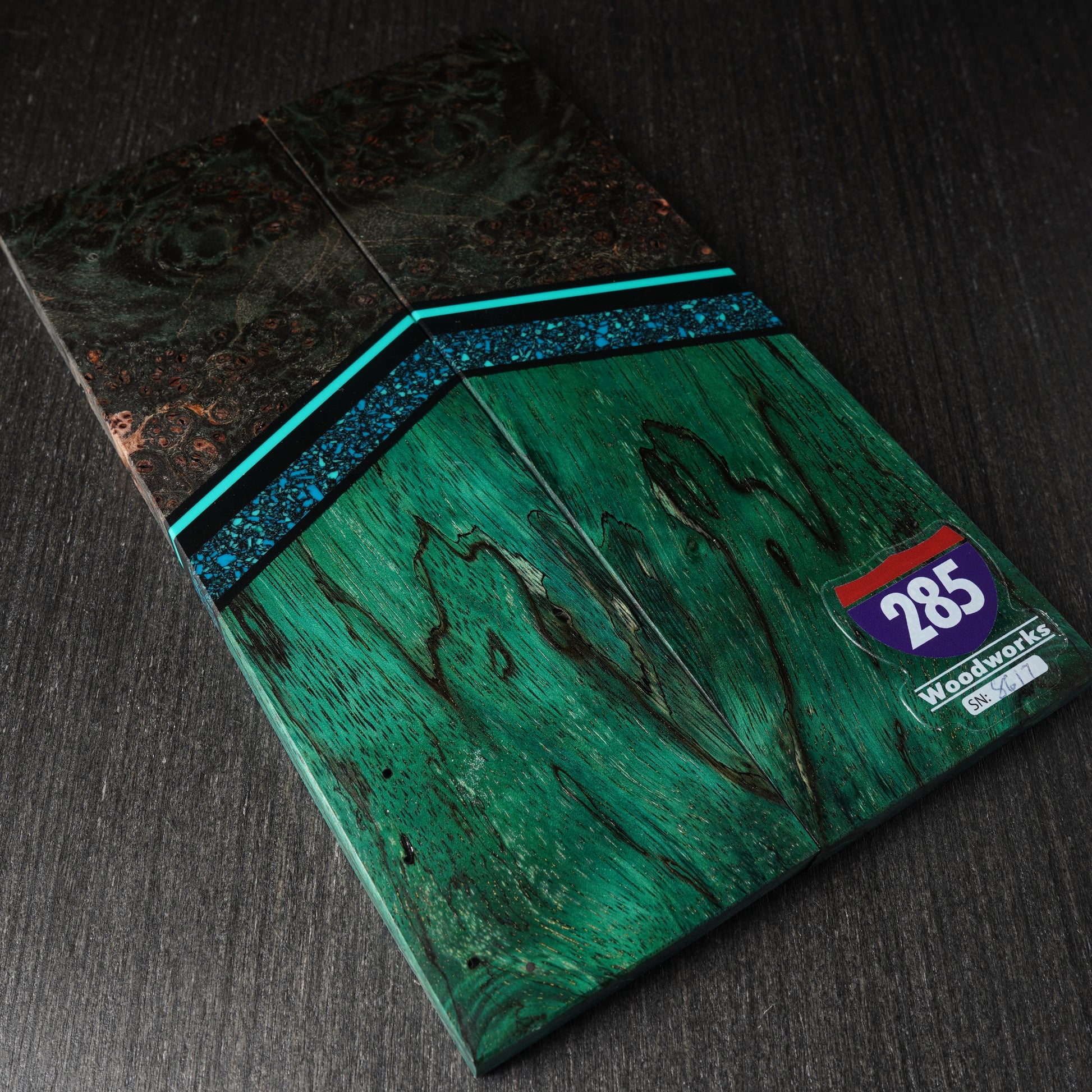 These hand crafted segmented knife scales are made one at a time using house stabilized woods and hand cast resin components. They ship flat, even, and ready for glue up. The scales pictured will be the exact set you receive. Buy with complete confidence.