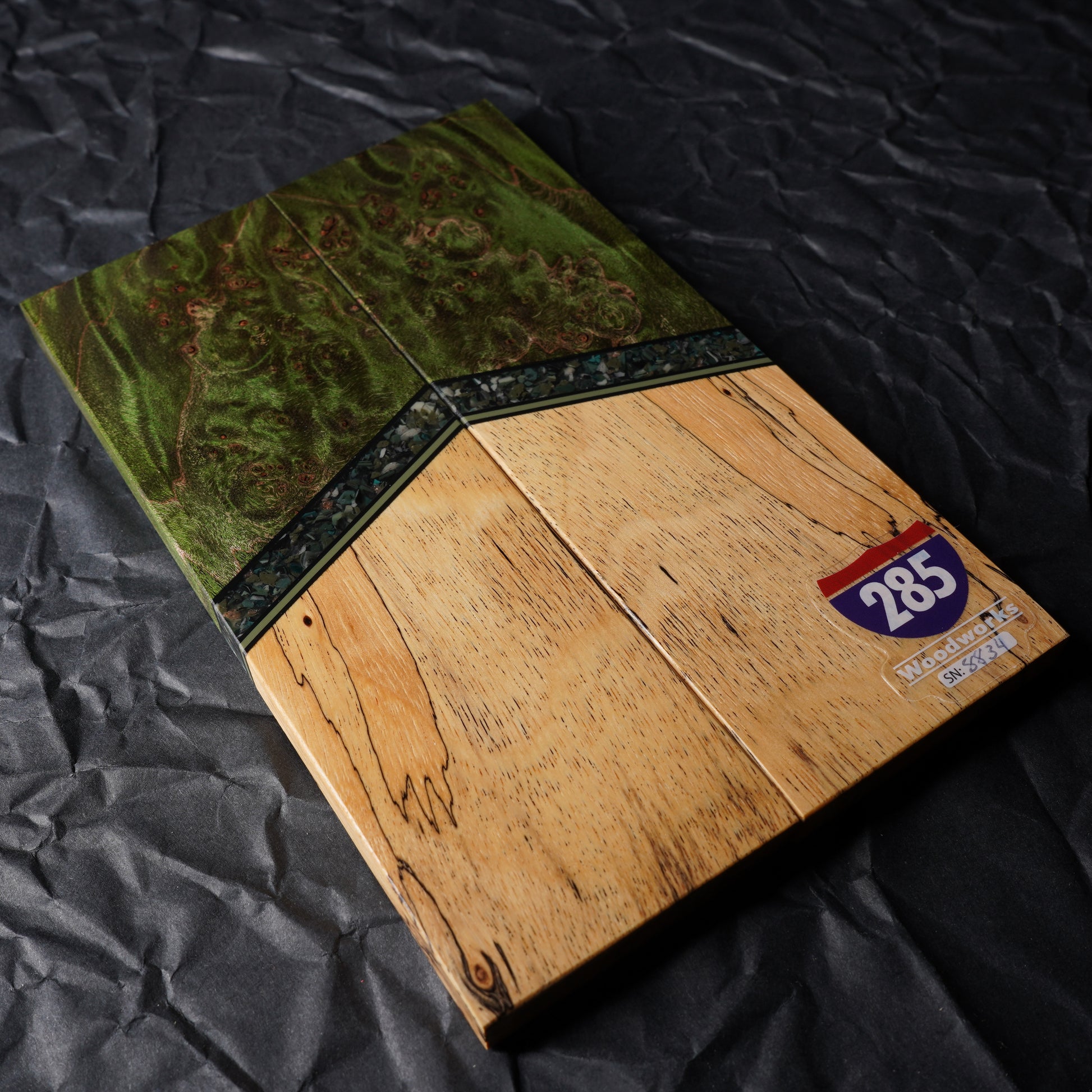 These hand crafted segmented knife scales are made one at a time using house stabilized woods and hand cast resin components. They ship flat, even, and ready for glue up. The scales pictured will be the exact set you receive. Buy with complete confidence.