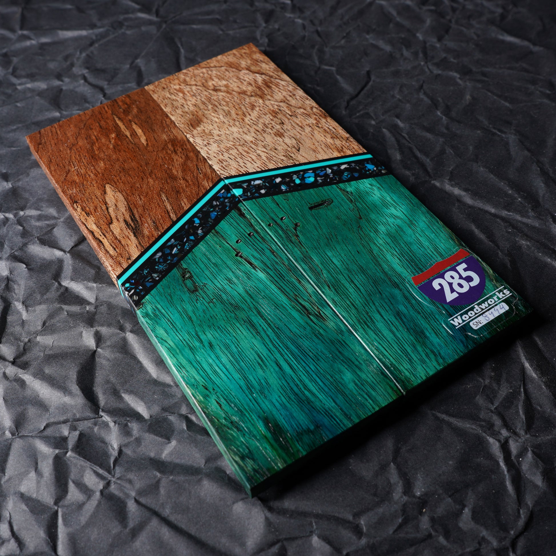 These hand crafted segmented knife scales are made one at a time using house stabilized woods and hand cast resin components. They ship flat, even, and ready for glue up. The scales pictured will be the exact set you receive. Buy with complete confidence.